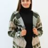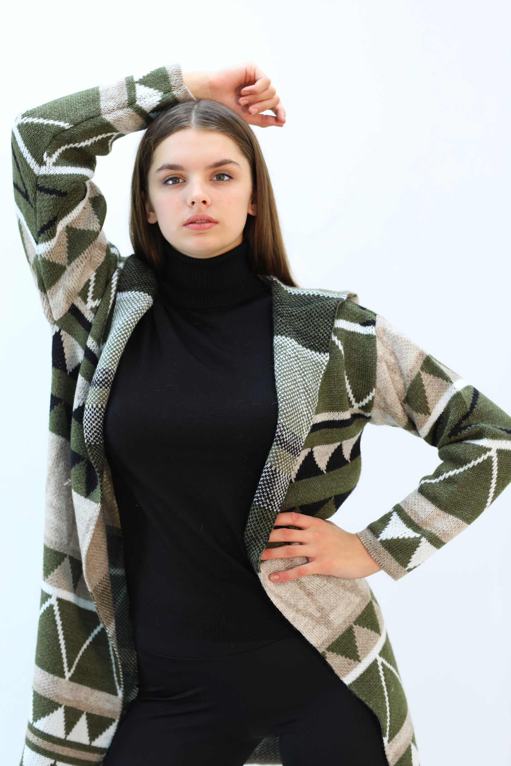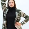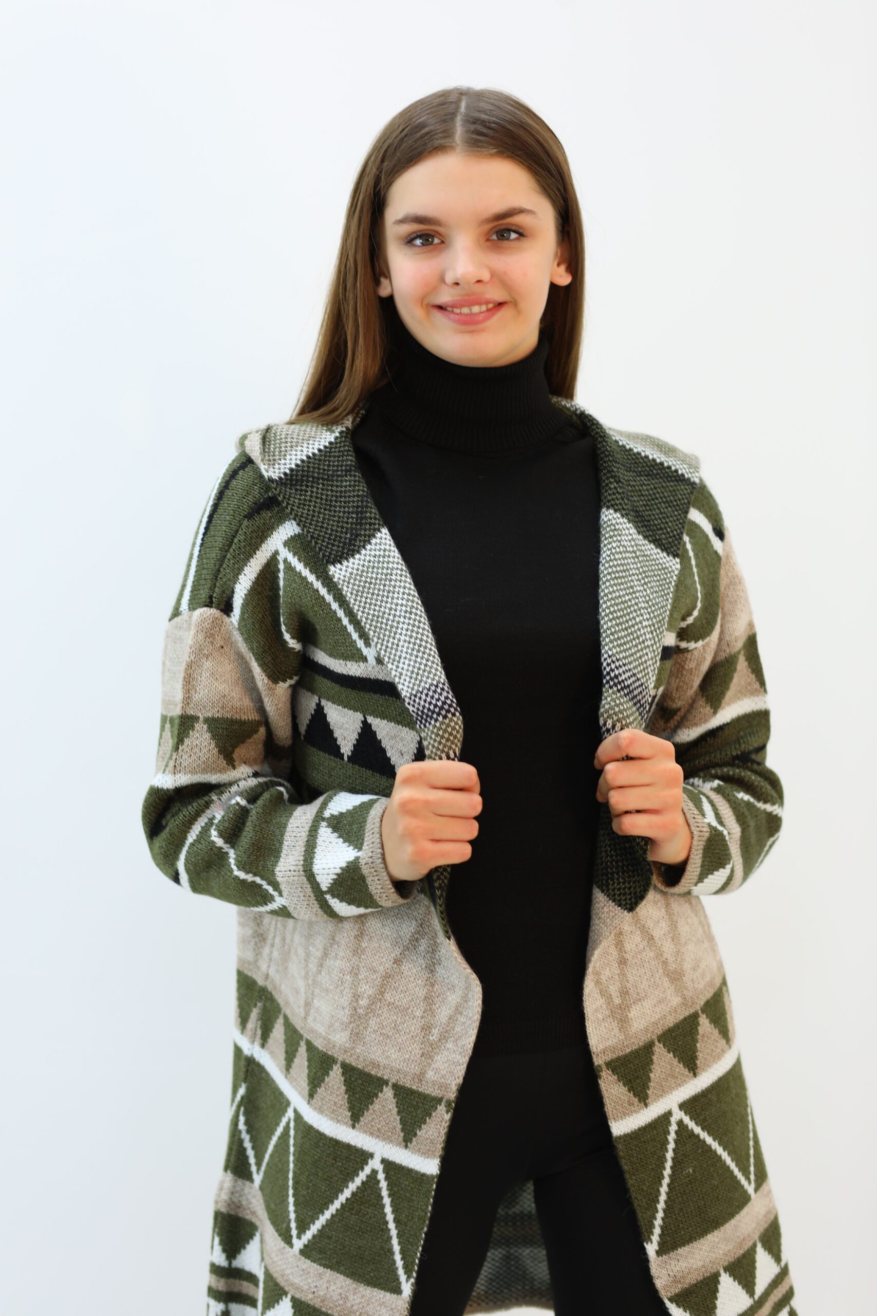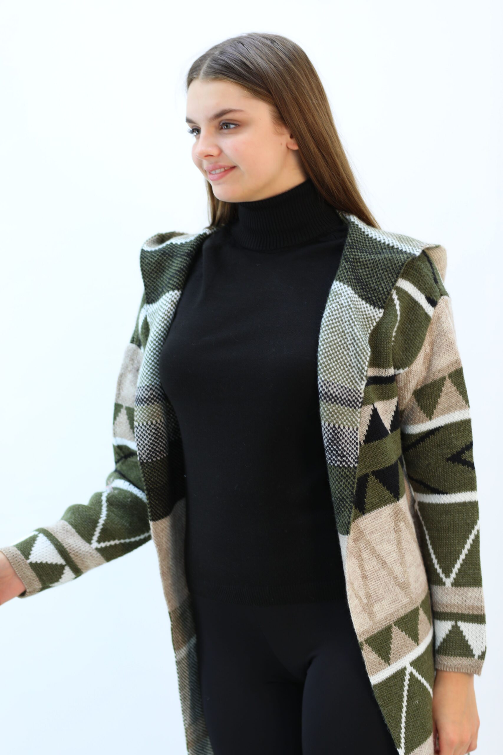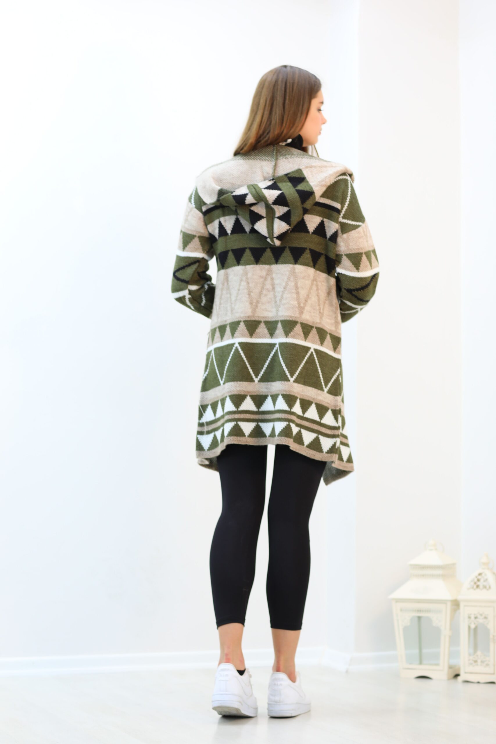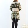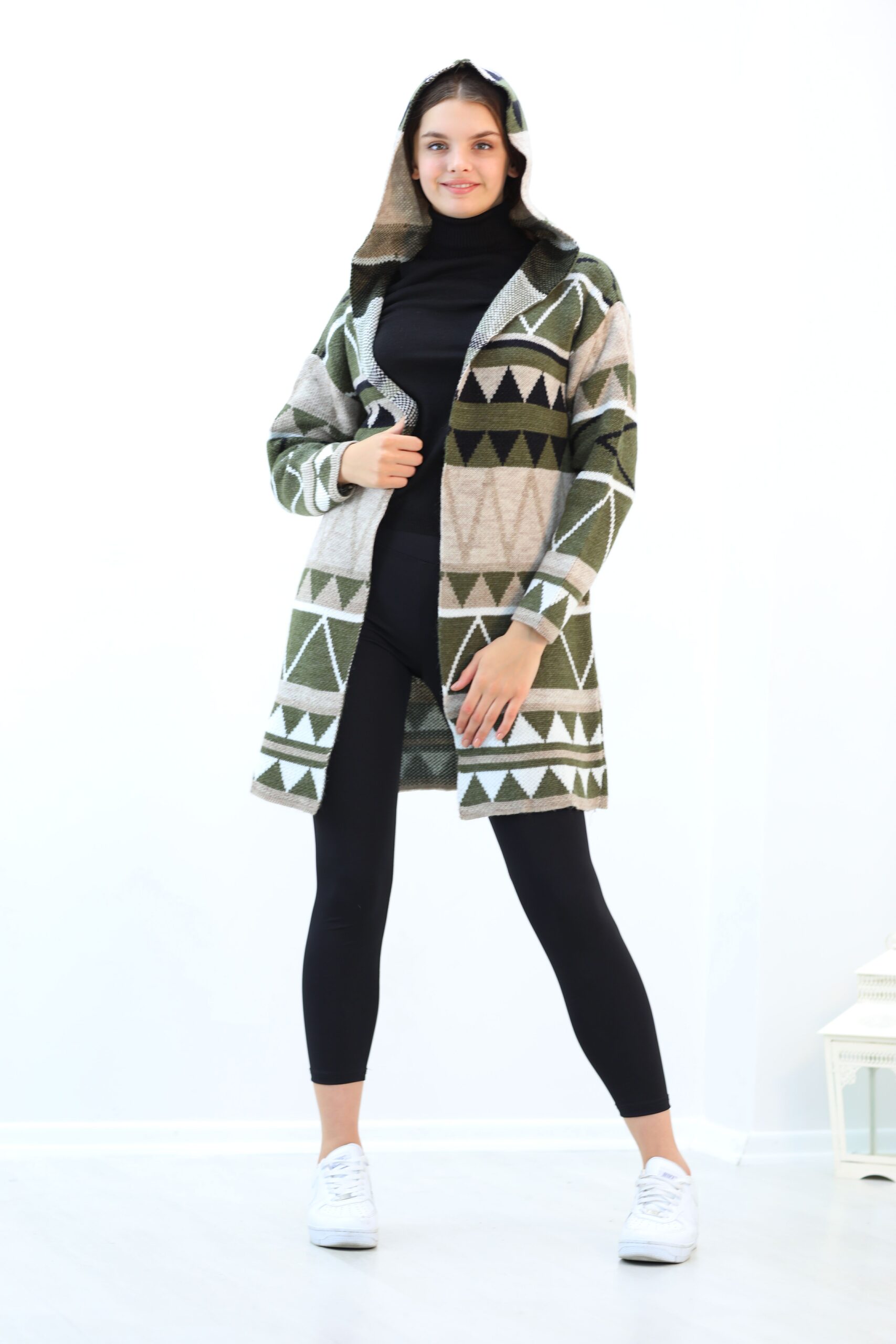 Desenlı Trıko Kapşonlu Triko Uzun Hırka